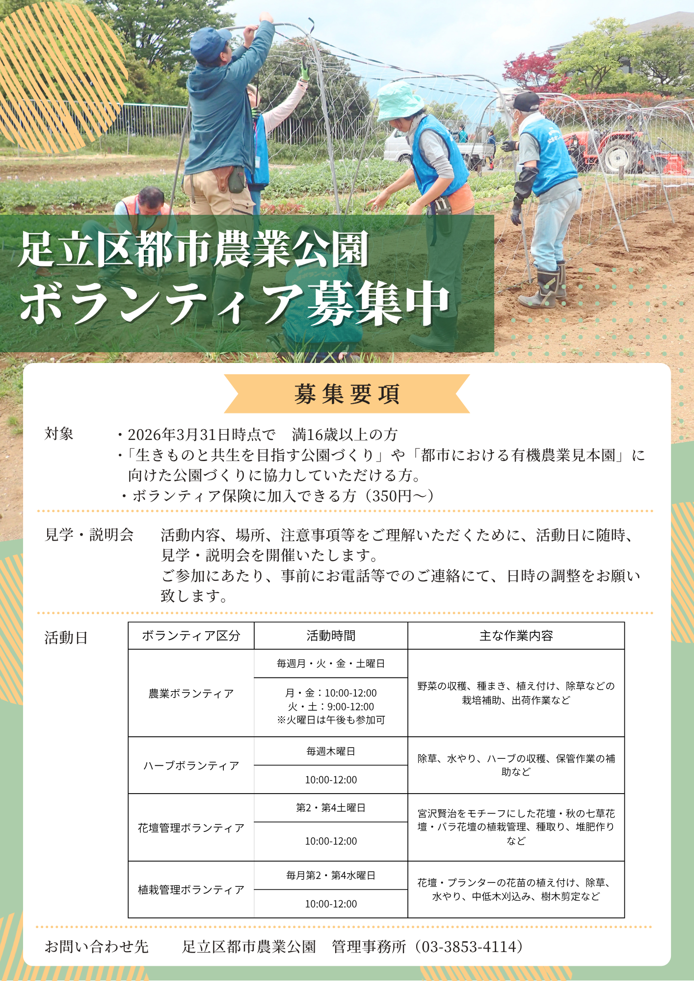 HOME | ご利用案内 | 公園ボランティア 足立区都市農業公園のボランティアを募集中! 足立区都市農業公園では、畑や花壇等緑地の維持管理活動のテーマとして「生きものと共生を目指す公園づくり」を掲げています。「都市における有機栽培見本園」を実現するため、この目標に沿ってより良い公園管理活動を一緒にしてくれる方を募集いたします。 自然によりそった活動をしてみませんか? ボランティアの種類と活動日