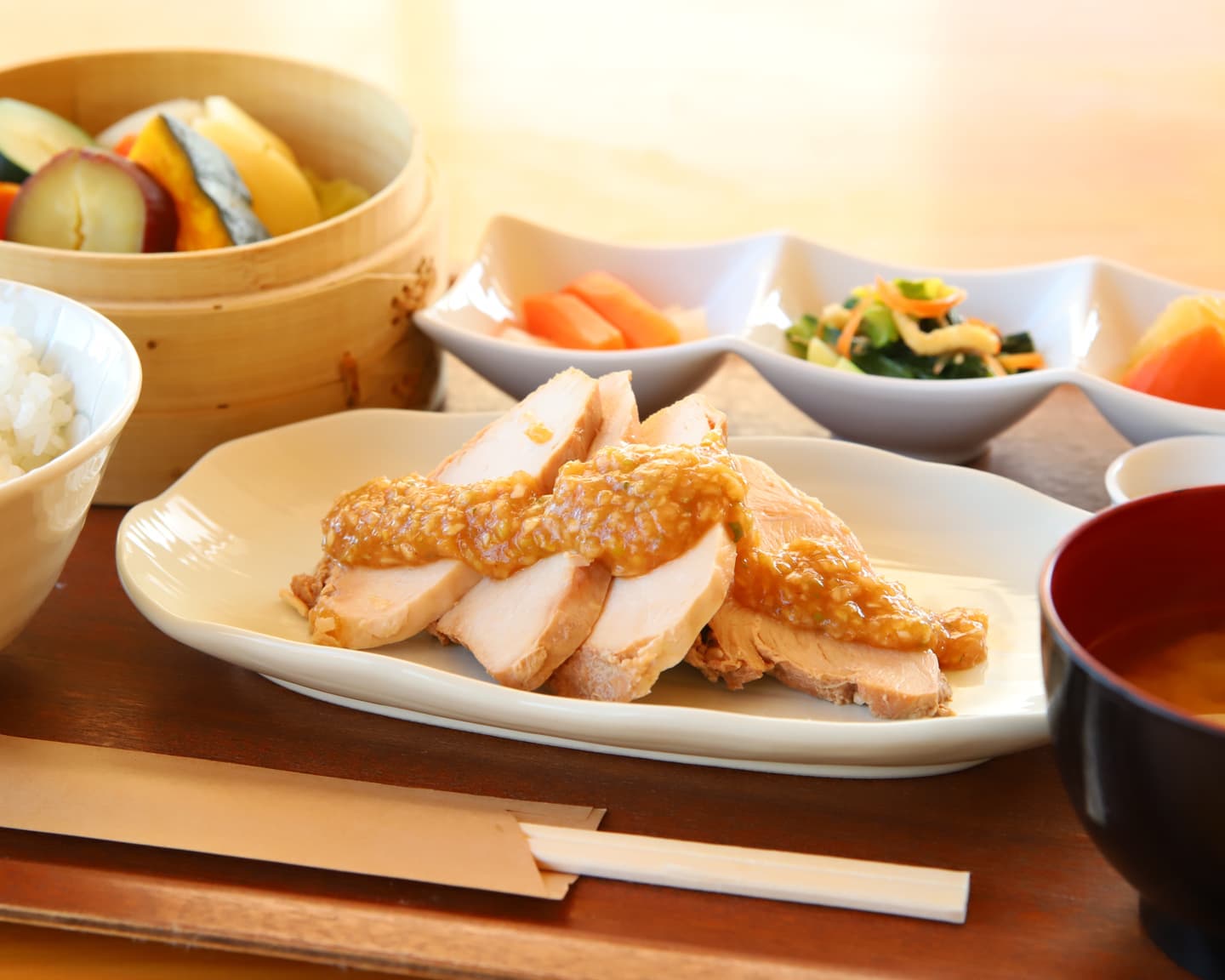 メインに季節の蒸し野菜とお味噌汁、ご飯、季節の小鉢がついた定食。蒸し野菜はバーニャカウダソースでお楽しみください。