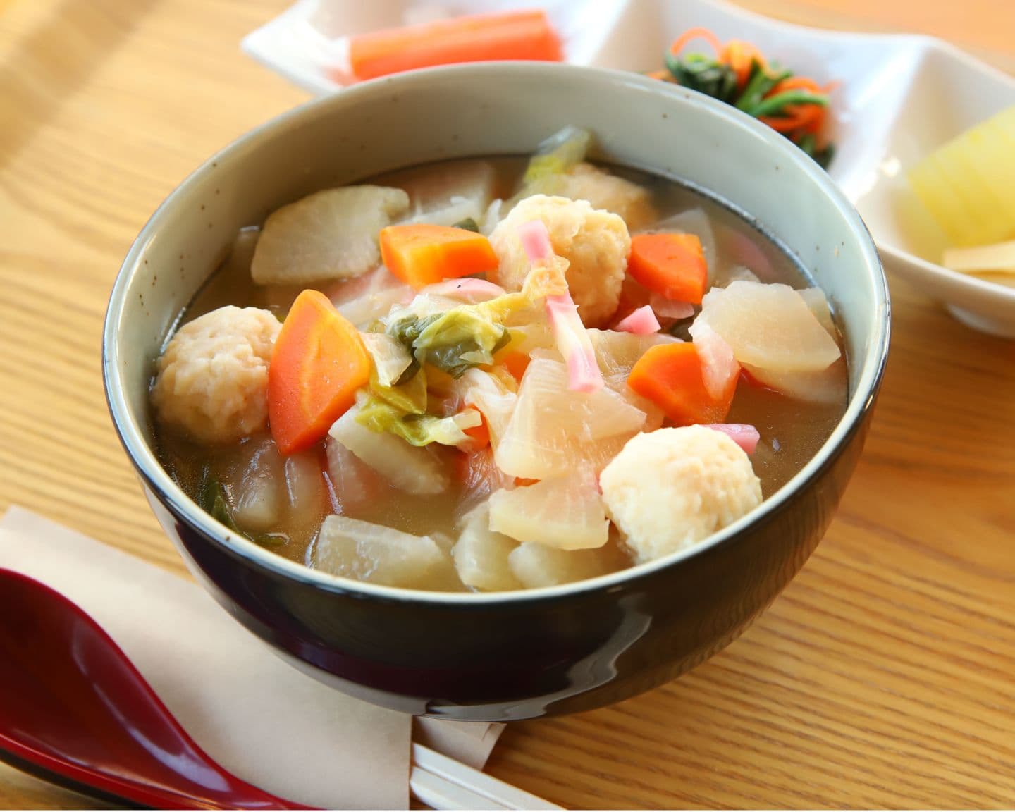 足立区で生産された小松菜「あだち菜」が練り込まれた麺を使用した、季節のうどんです。