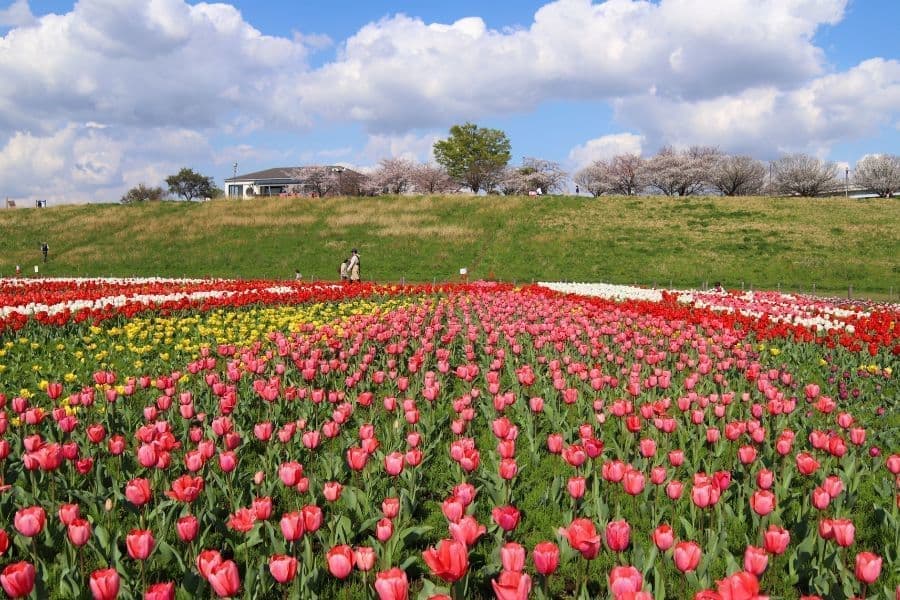 荒川河川敷の花壇で、チューリップをご覧いただけます。