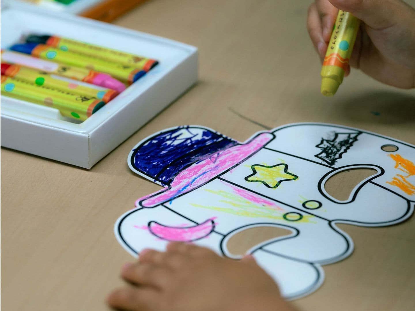 ハロウィンモチーフの型紙をぬりえでいろどり、着けられるおめんを作ります。
