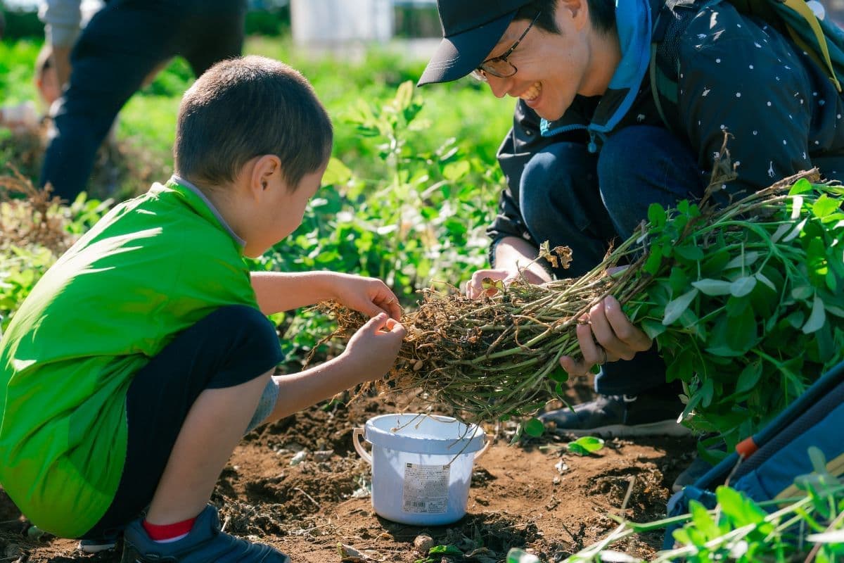 園内の田んぼや畑では自然の仕組みを活かした無農薬無化学肥料での栽培を行い収穫体験や、田植え・稲刈り体験などを実施しています。畑や田んぼでとれた収穫物は園内のマルシェで販売を行っています。